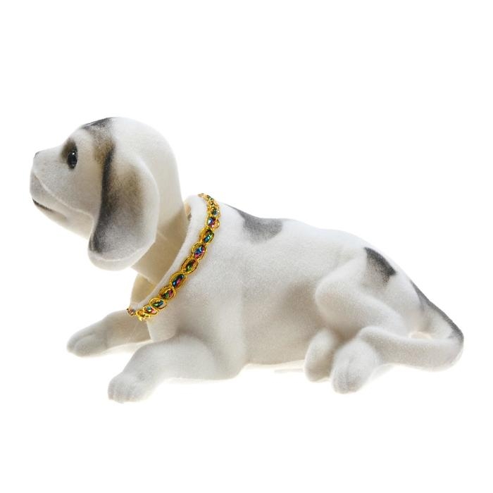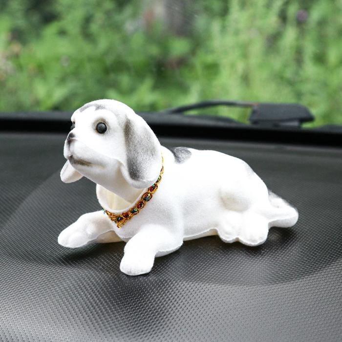 Собака на панель авто, качающая головой, большая, белый окрас