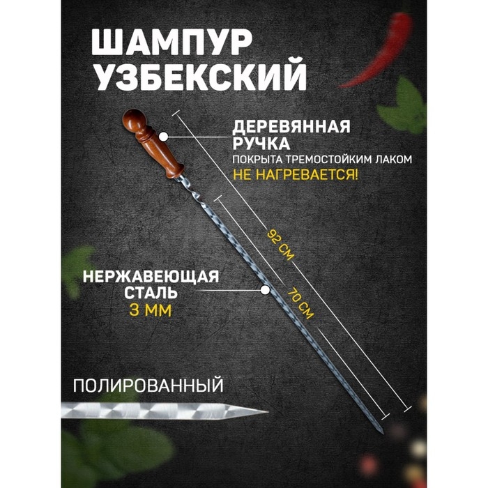 Шампур изготовлен из высококачественной нержавеющей стали, размер и толщина которой обеспечивает равномерную прожарку и сохранение сочности мяса. Резная деревянная рукоять не только придает шарм внешнему виду шампура, но и обеспечивает удобный захват и предотвращает ожоги.