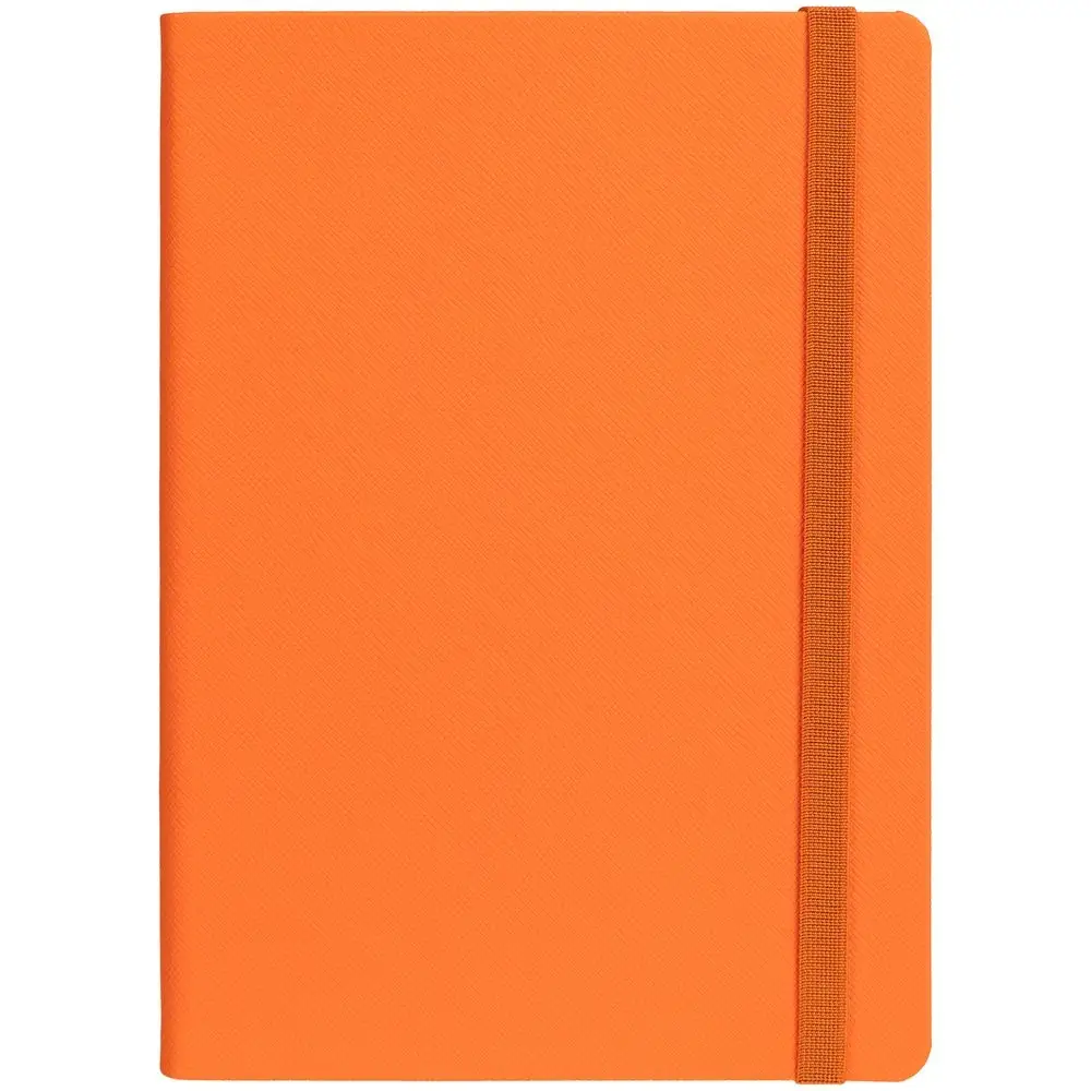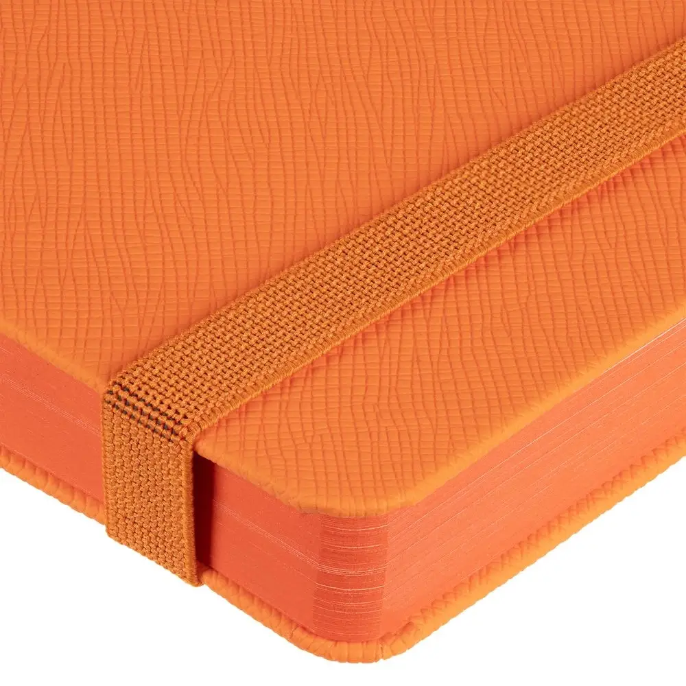 Ежедневник с твердой обложкой выполнен из материала Nice Touch, оранжевый ОО, и дополнен резинкой шириной 1 см и ляссе оранжевого цвета.