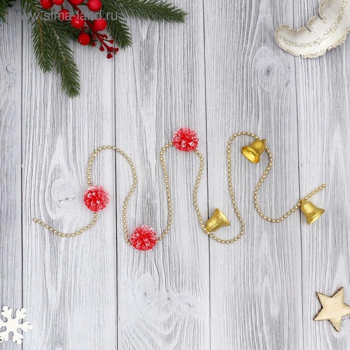 Бусы на ёлку 1 м "Шишки и колокольчики" золотисто-красный