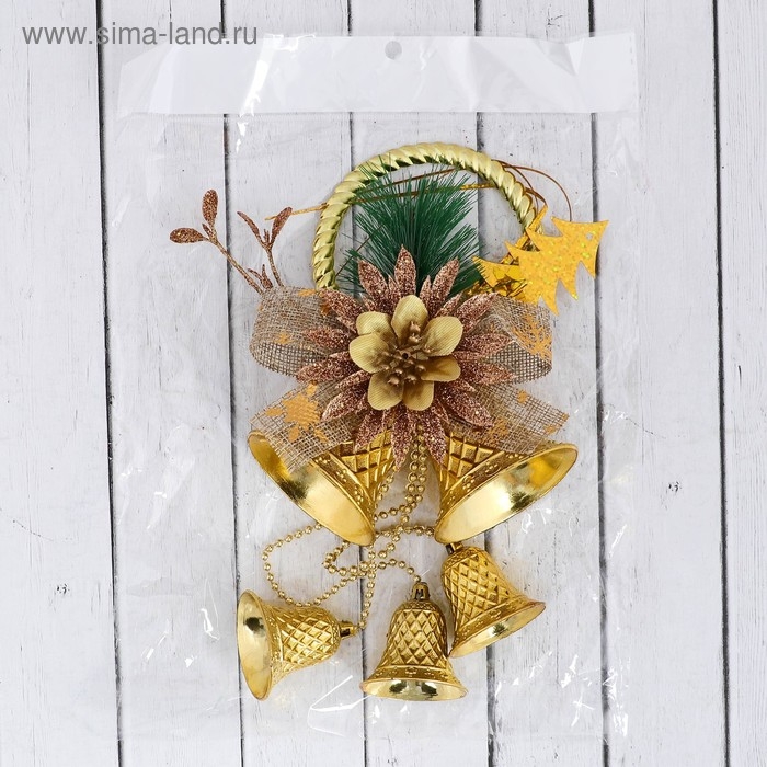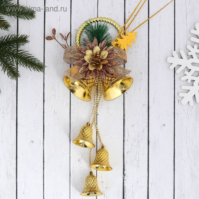 Украшение новогоднее "Колокольчики на кольце с цветком и бантиком" 12х30 см, золото