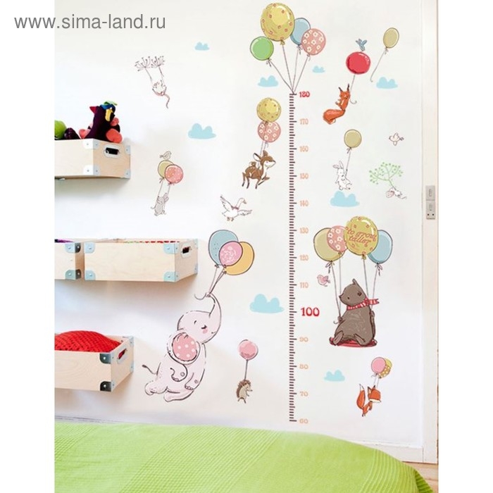 Наклейка пластик интерьерная ростомер "Зверята с воздушными шариками" 60х90 см