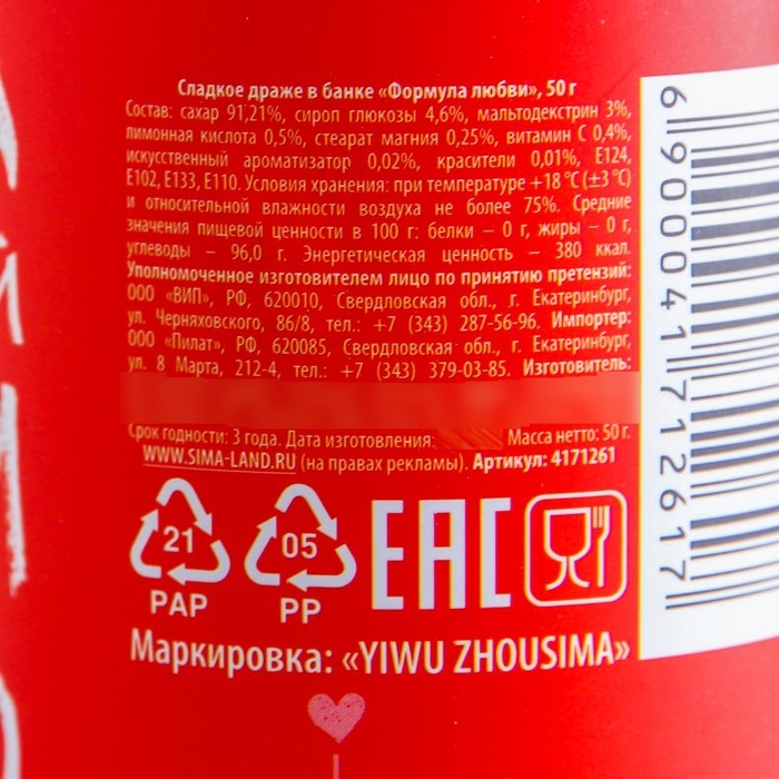 Состав: сахар 91,21%, сироп глюкозы 4,6%, мальтодекстрин 3%, лимонная кислота 0,5%, стеарат магния 0,25%, витамин С 0,4%, искусственный ароматизатор 0,02%, красители 0,01%, Е124, Е102, Е133, Е110.
