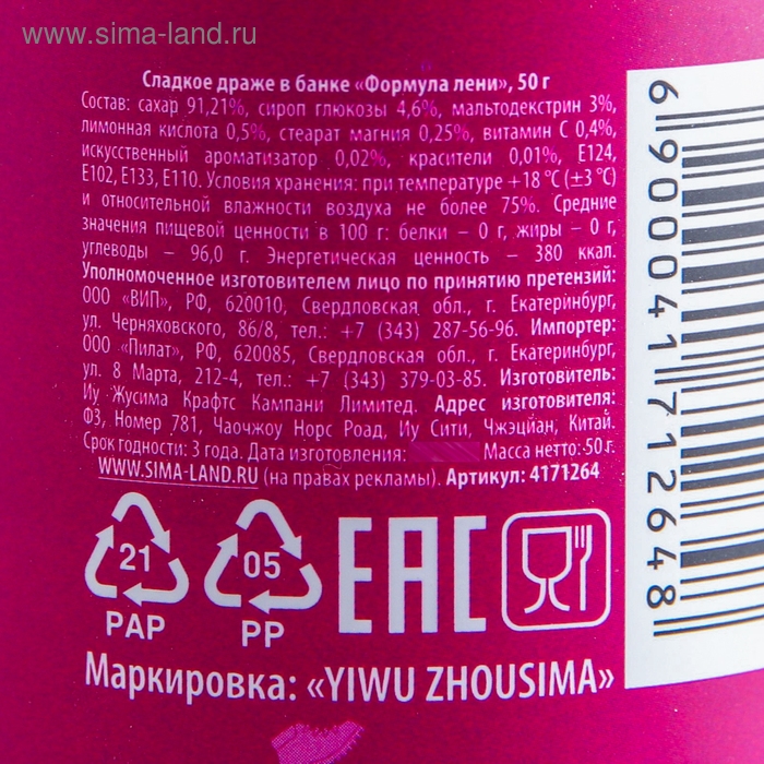 Состав: сахар 91,21%, сироп глюкозы 4,6%, мальтодекстрин 3%, лимонная кислота 0,5%, стеарат магния 0,25%, витамин С 0,4%, искусственный ароматизатор 0,02%, красители 0,01%, Е124, Е102, Е133, Е110.