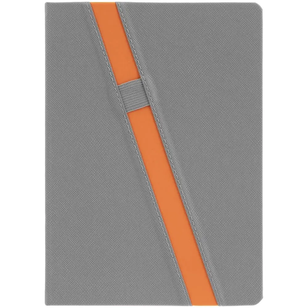 Ежедневник с твердой обложкой и тонированным обрезом. Выполнен из материала Nice Touch, серый СС, и Soft Touch, оранжевый ОО, дополнен серым ляссе.