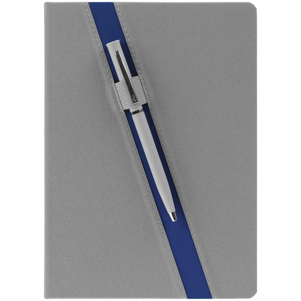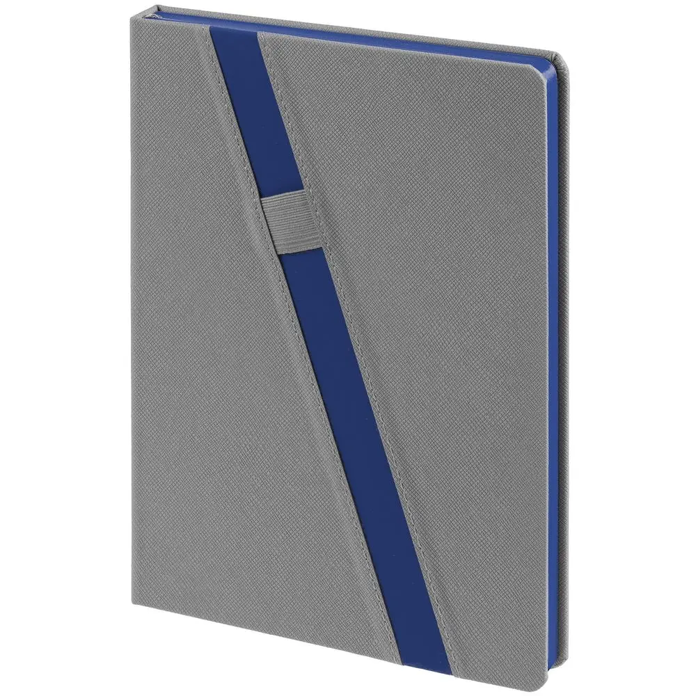 Ежедневник с твердой обложкой и тонированным обрезом. Выполнен из материала Nice Touch, серый СС, и Soft Touch Ultra, синий НН, дополнен серым ляссе.