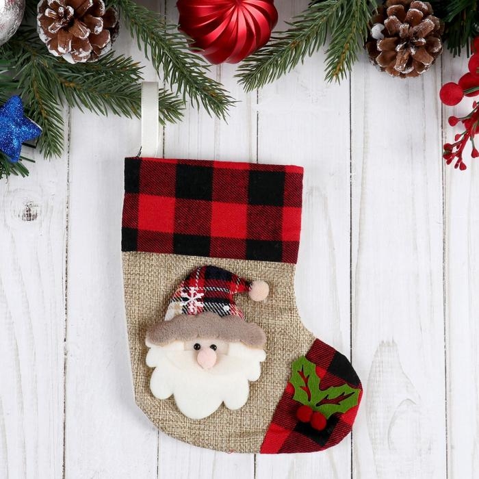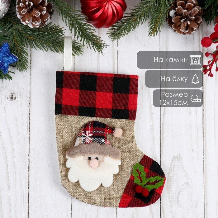 Носок для подарков "Дед Мороз, остролист" 12х15,5 см, красно-коричневый