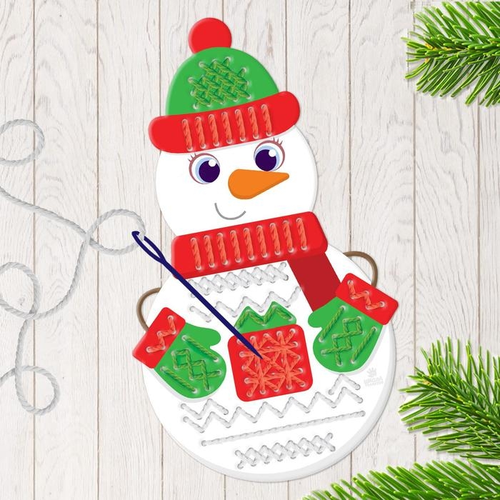 Вышивка пряжей на новый год «Снеговик» на картоне с пластиковой иглой, новогодний набор для творчества