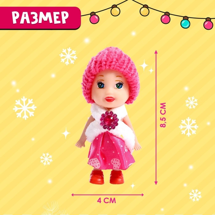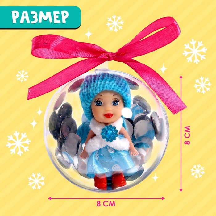 - Нежная куколка высотой 8 см находится внутри прозрачного шара размером 8х8 см и станет прекрасным компаньоном для игр. Ее шапочка надежно прикреплена к голове.