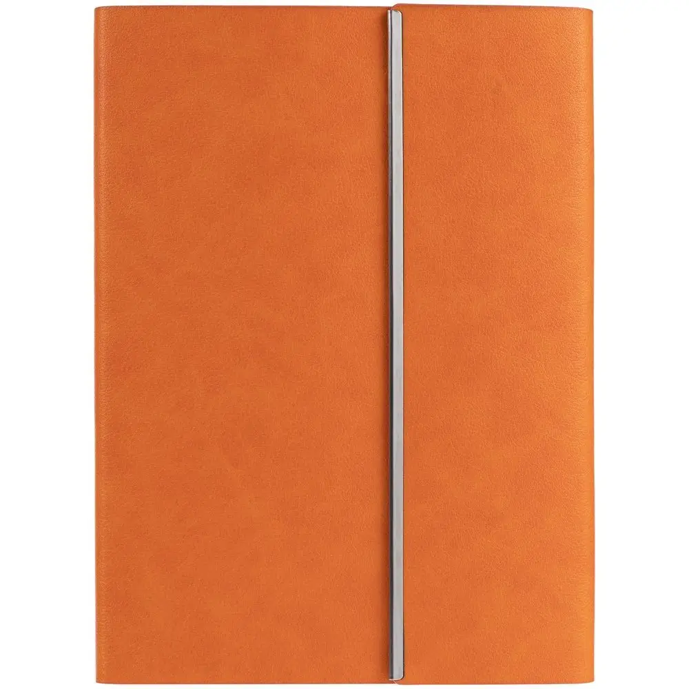 Ежедневник с гибкой обложкой, клапаном на магните и металлической отделкой клапана. Выполнен из материала Petrus, оранжевый ОО, дополнен серым ляссе.