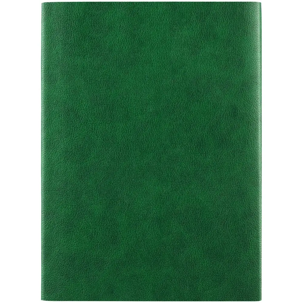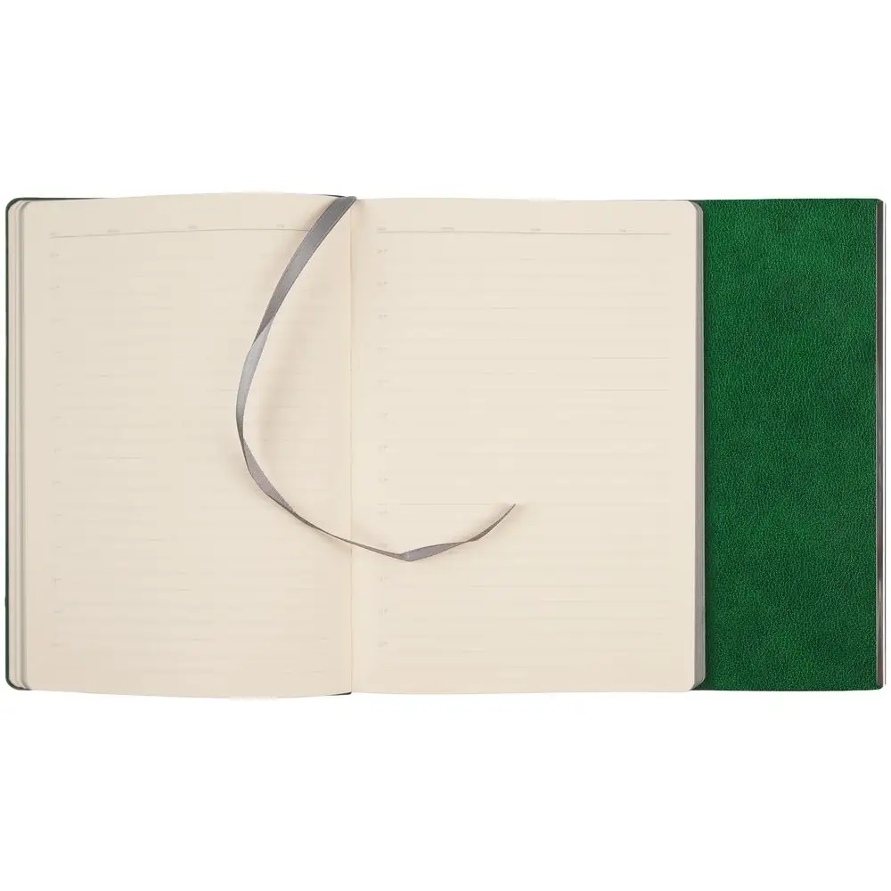 Ежедневник с гибкой обложкой, клапаном на магните и металлической отделкой клапана. Выполнен из материала Petrus, зеленый FF, дополнен серым ляссе.