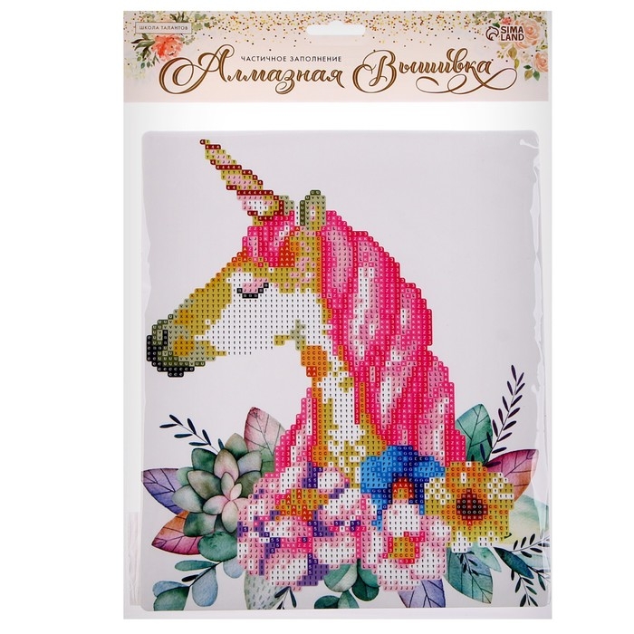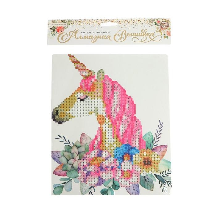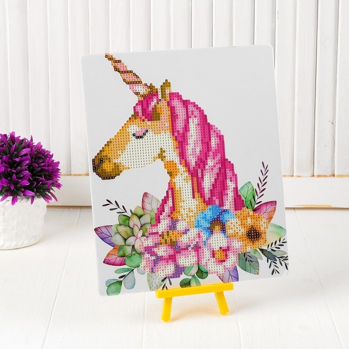 Алмазная вышивка «Единорог в цветах», 21 × 25 см, с частичным заполнением, с подставкой
