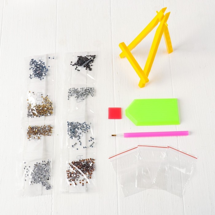 - Набор включает все необходимые материалы: картонный холст со схемой, стразы, карандаш для страз, клеевую подушечку, подставку для картины и ёмкость для страз.