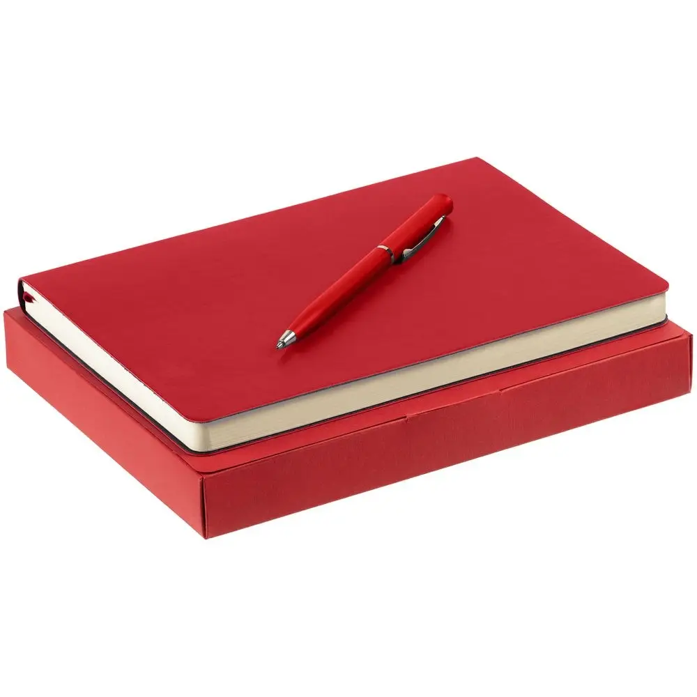 Недатированный ежедневник с гибкой обложкой из материала Latte с ляссе в цвет обложки, а также ручка в тон — в подарочной коробке из дизайнерского картона.