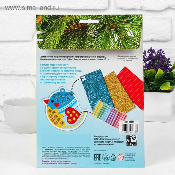 Набор для детского творчества-аппликация «Набор ёлочных украшений» состоит из 4 двусторонних цветных картонных игрушек в виде двух шаров разной формы, ёлки и колокольчика. Ребёнку необходимо украсить их объёмными самоклеящимися квадратиками и стразами. Этот процесс превосходно разовьёт моторику неловких пальчиков и раскроет творческие способности.