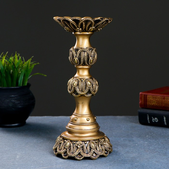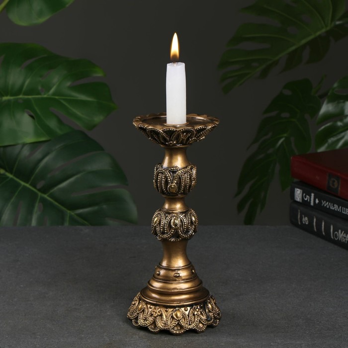 Подсвечник на резной круглой подставке, золото 11х11х25 см, для свечи d=5,5 см