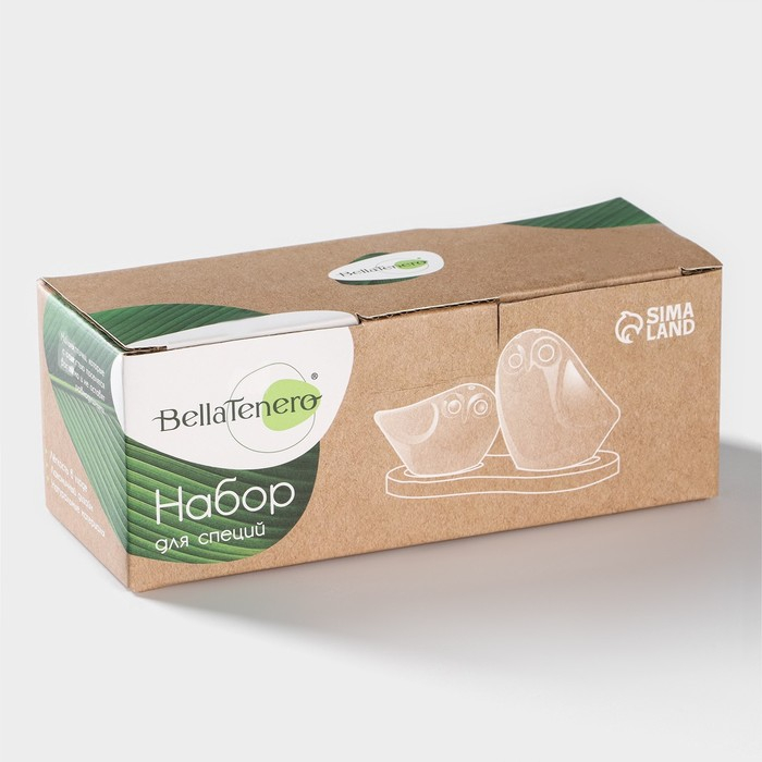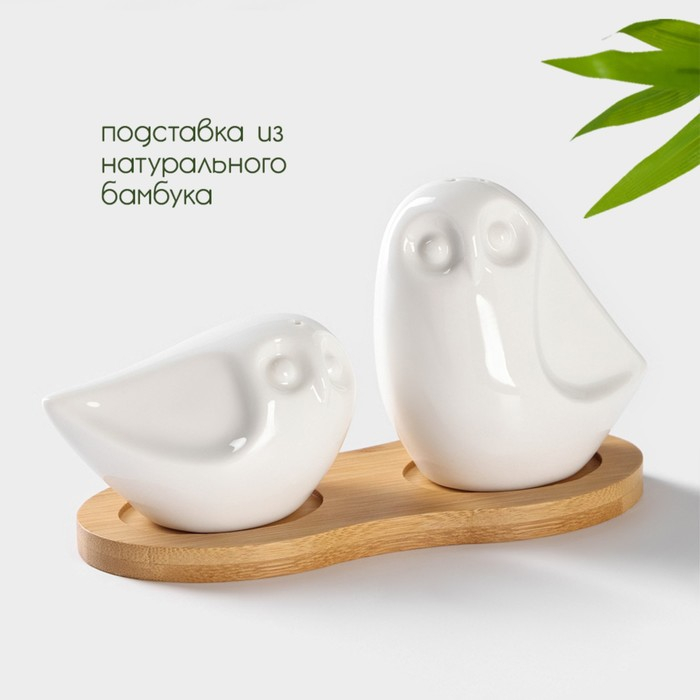 Набор фарфоровый для специй на бамбуковой подставке BellaTenero «Совы», 2 предмета: солонка 100 мл, перечница 130 мл, цвет белый