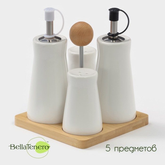 Набор фарфоровый для специй на бамбуковой подставке BellaTenero, 5 предметов: солонка, перечница, 2 соусника, подставка-держатель, цвет белый