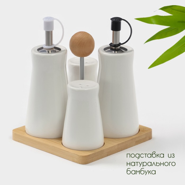 Набор фарфоровый для специй на бамбуковой подставке BellaTenero «Листья», 4 предмета: солонка 120 мл, перечница 120 мл, салфетница, подставка, цвет белый