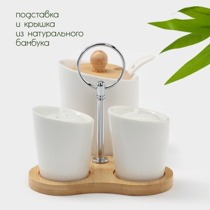Набор фарфоровый для специй на бамбуковой подставке BellaTenero «Листья», 4 предмета: солонка 120 мл, перечница 120 мл, салфетница, подставка, цвет белый