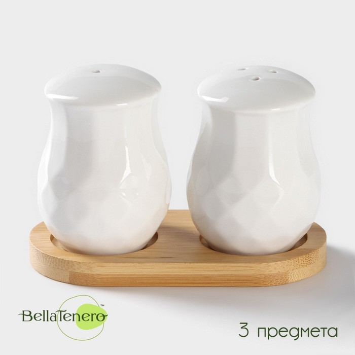 Набор фарфоровый для специй на бамбуковой подставке BellaTenero, 3 предмета: солонка 130 мл, перечница 130 мл, подставка, цвет белый