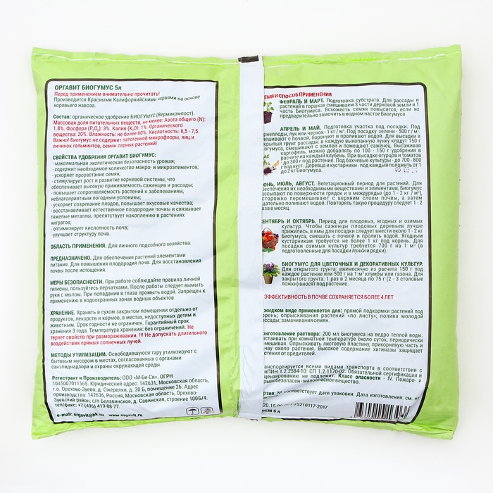 Оргавит Биогумус поставляется в удобной упаковке объемом 5 литров, что позволяет использовать его на больших площадях. Применение данного удобрения позволит Вам получить здоровые и крепкие растения, которые будут радовать Вас своим красивым видом и обильным цветением.