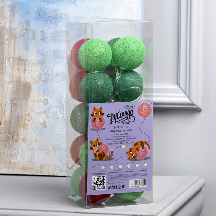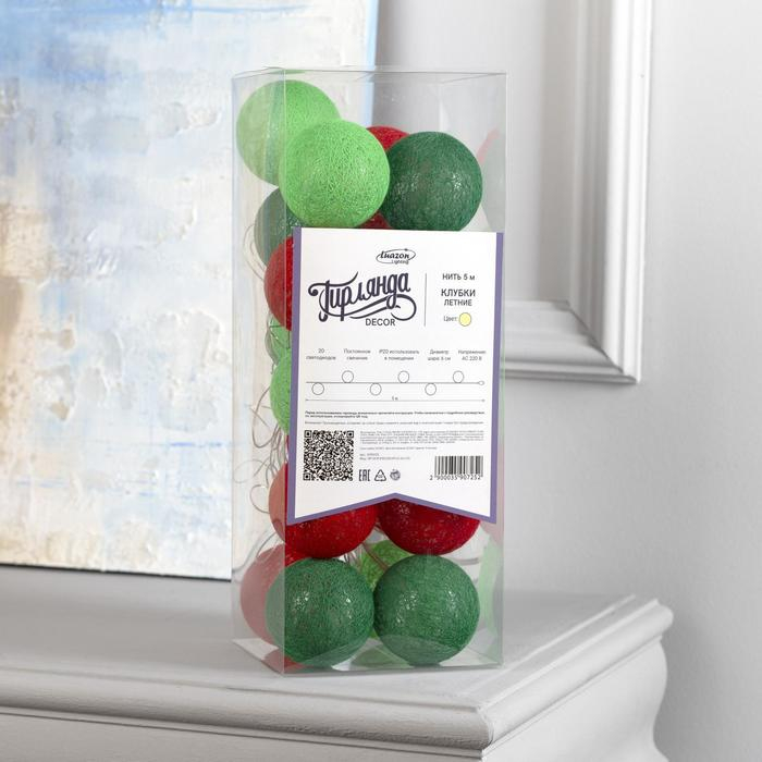 Гирлянда «Нить» 5 м с насадками «Клубки летние», IP20, прозрачная нить, 20 LED, свечение тёплое белое, 220 В