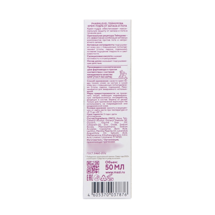 Крем пудра Теймурова - это уникальное средство от пота и запаха, разработанное фармацевтами. Этот дезодорант в виде крема для рук и ног создан специально для тех, кто подвержен повышенной потливости. Благодаря своей формуле и бархатной текстуре, он эффективно устраняет запах и избыточное потоотделение. Если вам необходимо найти дезодорант крем от запаха, то крем-пудра Теймурова - отличный выбор. Антибактериальный крем пудра Теймурова - это не только дезодорант для стоп от запаха и пота, он также эффективен для борьбы с потоотделением подмышек и ладоней. Если вы хотите избавиться от неприятного запаха в этой зоне тела, то этот дезодорант поможет вам справиться с этой задачей. Этот крем антиперспирант предназначен не только для устранения запаха и пота, но и для создания ощущения свежести. Наличие талька и натуральных эфирных масел делают крем питательным и увлажняющим. Он делает вашу кожу мягкой и гладкой, а также придает приятный запах для тела без ощущения липкости. Если вам нужно средство от высокого потоотделения, то крем с тальком от пота Теймурова - ваш надежный помощник. Использование крем пудры Теймурова не только устраняет запах, но и предотвращает его возникновение, а также подсушивает кожу рук, ног и других частей тела. Тальк эффективно справляется с проблемой запаха ног и избыточной потливости ладоней, обеспечивая длительное ощущение сухости и комфорта. Крем пудра Теймурова также является отличным кремом от пота подмышек и запаха. Его уникальная формула позволяет эффективно бороться с неприятным запахом и излишним потоотделением в любой области тела. Для тех, кто ищет натуральный и эффективный крем для тела, средство от пота Теймурова - это безопасное и надежное решение.