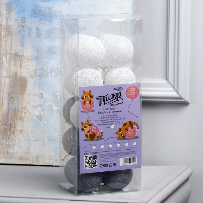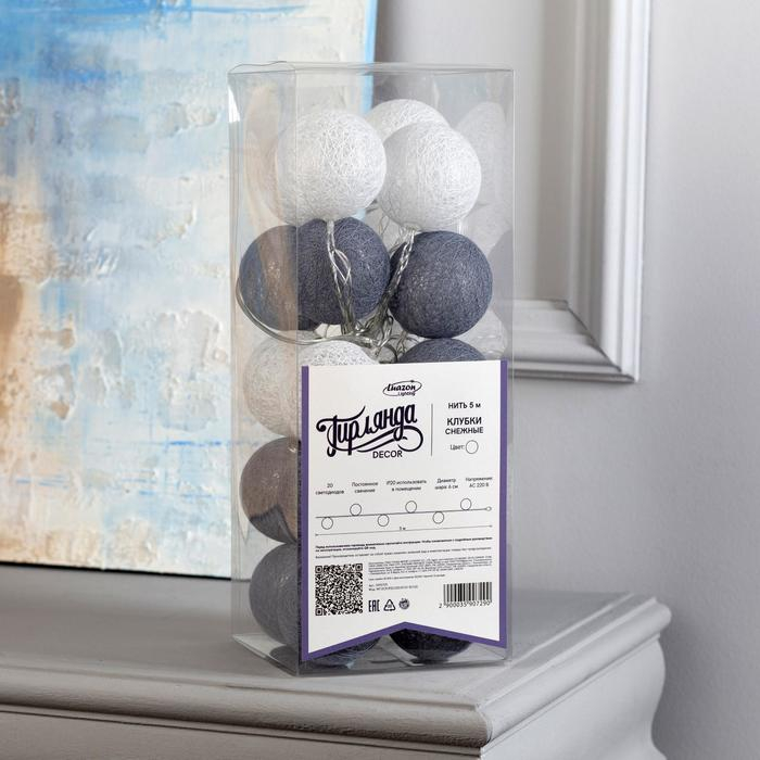 Гирлянда «Нить» 5 м с насадками «Клубки снежные», IP20, прозрачная нить, 20 LED, свечение белое, 220 В