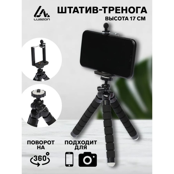 Штатив-тренога Luazon настольный, для телефона шириной до 7 см, гибкие ножки, высота 17 см, чёрный