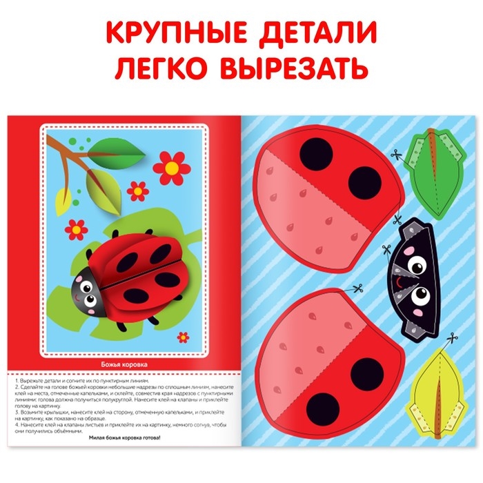 На каждой странице подробно описаны правила создания аппликации. Для работы малышу потребуются ножницы, клей и ваша помощь. Для удобства в книге есть условные обозначения необходимых действий: вырезать, согнуть, завить ножницами, нанести клей.