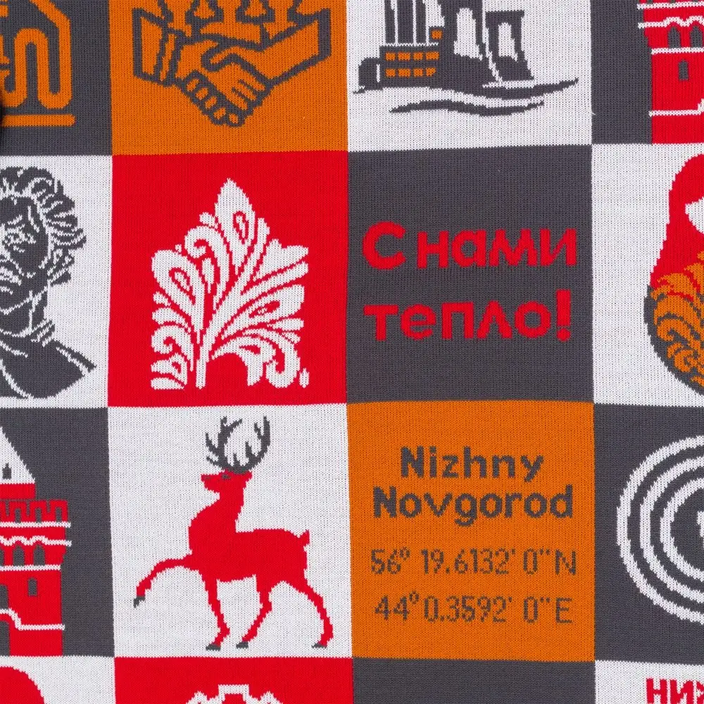 Модель: плед жаккардовой вязки, гладкая поверхность, 4 цвета нитей, рябая изнанка.
