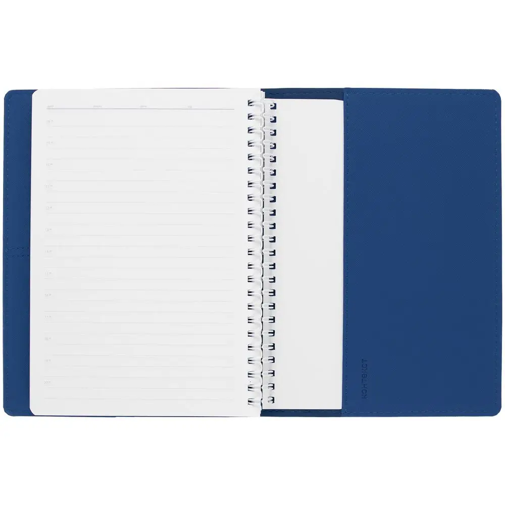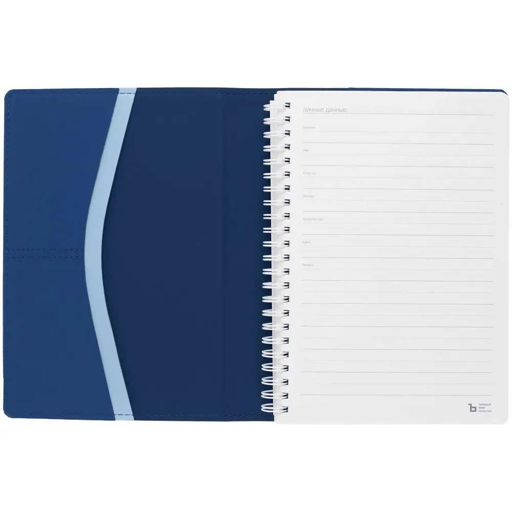 Ежедневник с блоком на пружине в твердой обложке, выполнен из материалов Nice Touch, синий НН и Soft Touch синий/голубой.