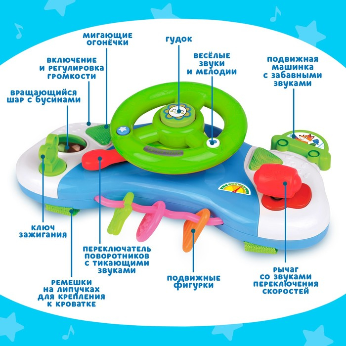 Музыкальный руль-подвеска поможет развить воображение, звуковое восприятие, мелкую моторику рук. Игрушка воспроизводит 20 мелодий и звуков.