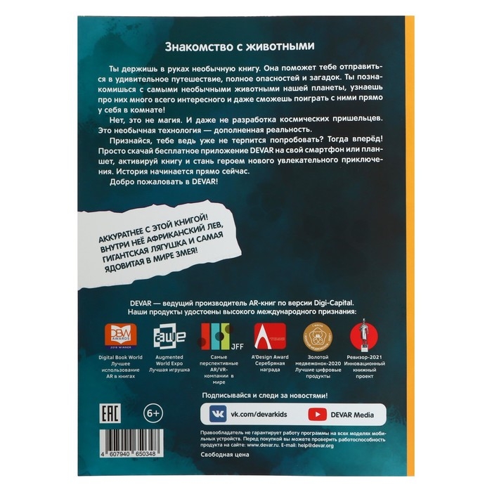 По многочисленным просьбам мы выбрали из наших популярных энциклопедий самые увлекательные факты, объединили их и выпустили в более компактном формате. Теперь каждый сможет завести жирафа и погладить льва! Они оживут в 4D–объёме в дополненной реальности с помощью бесплатного приложения от Devar.