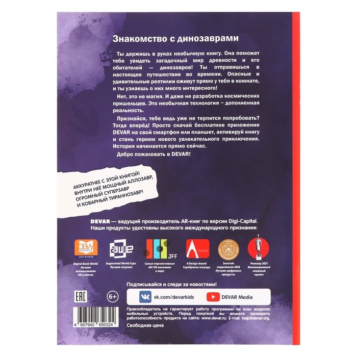 По многочисленным просьбам мы выбрали из наших популярных энциклопедий самые увлекательные факты, объединили их и выпустили в более компактном формате. Теперь каждый сможет завести дома динозавра! Трицератопс совсем проголодался, а тираннозавр давно не рычал… Пора оживить их в 4D–объёме в дополненной реальности с помощью бесплатного приложения от Devar.