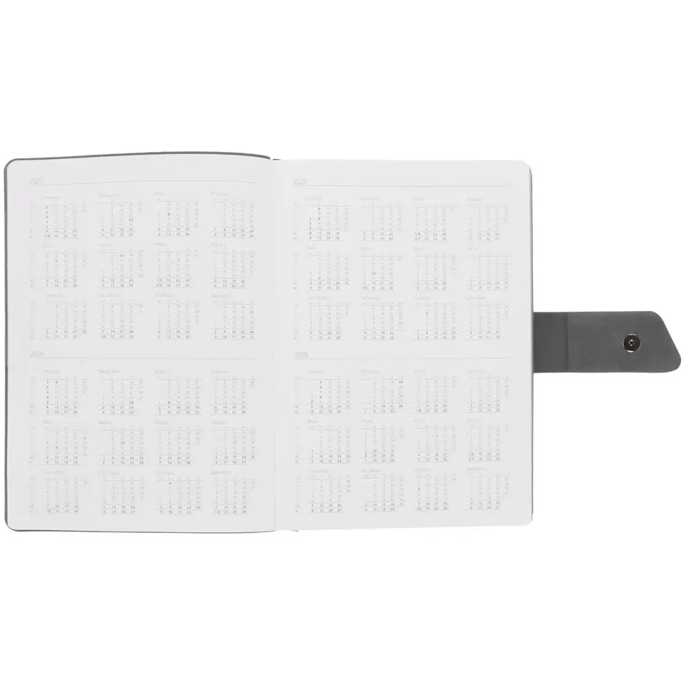 Ежедневник с гибкой обложкой, выполнен из материала La Fite, черный АА и Nubuck, серый СС, дополнен серым ляссе и хлястиком на кнопке.