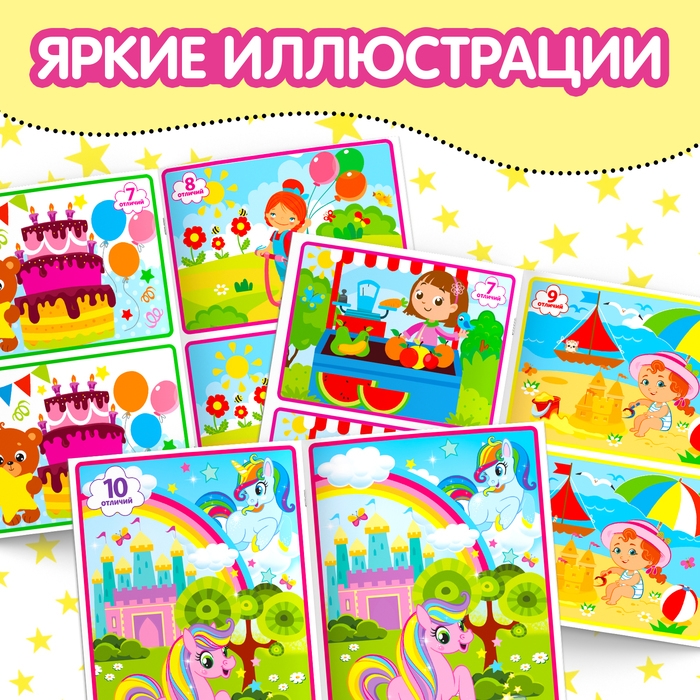 На каждой странице книги представлены увлекательные логические задания на смекалку с изображениями единорожек, принцесс, русалочек и многое другое. Ребёнку необходимо найти на картинках отличия. На красочных иллюстрациях есть много элементов — искать и находить несоответствия будет увлекательнее вдвойне!