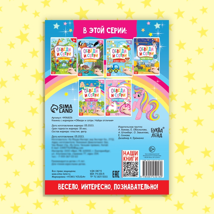 В книге 12 страниц. Они выполнены из бумаги, маркер — из пластика. Издание рекомендовано детям старше 4 лет.