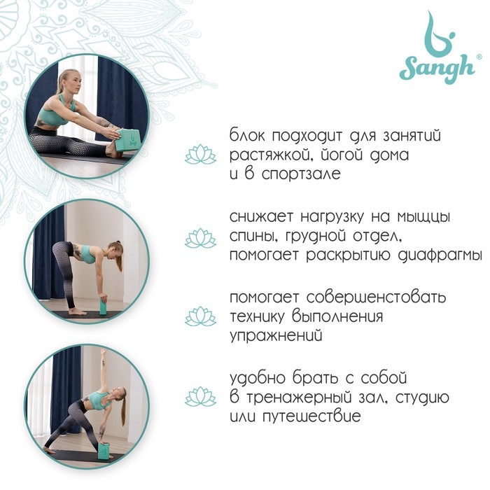 Блок для йоги Sangh, 23х15х8 см, цвет мятный