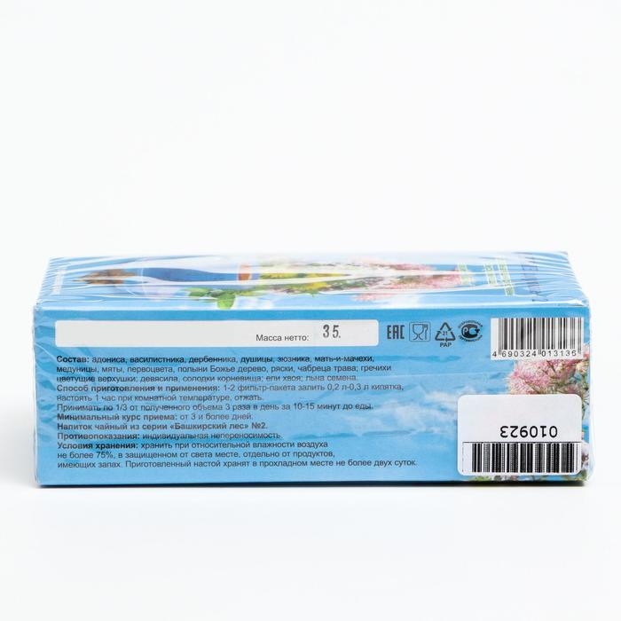 Состав: адониса, дербенника, душицы, зюзника, мать-и-мачехи, медуницы, мяты, первоцвета, полыни Божье дерево, ряски, чабреца трава, гречихи цветущие верхушки, девясила, солодки корневища, ели хвоя, льна семена.