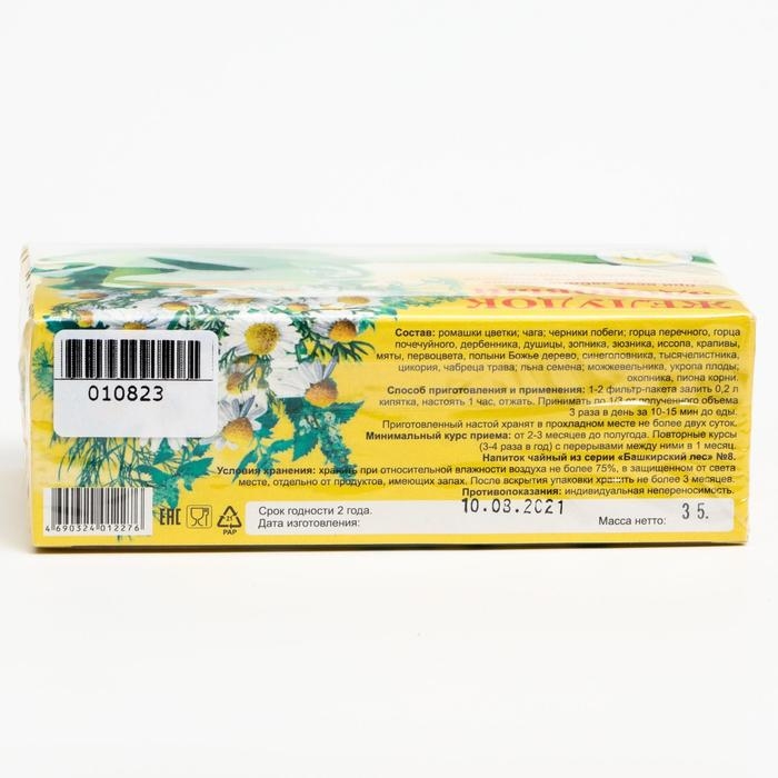 Состав: гречихи цветущие верхушки, дербенника, душицы, зопника, зюзника, крапивы, мяты, первоцвета, полыни Божье дерево, синеголовника, тысячелистника, цикория, чабреца трава, льна семена, можжевельника, укропа плоды, окопника, пиона корни, ромашки цветки, чага, черники побеги.