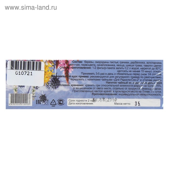 Минимальный курс приема: Рекомендован для регулярного приема по самочувствию. Чередовать с напитком чайным "Для радости Сон-2" и "Голова умная".
