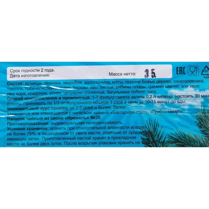 Состав: почки березы, листья березы, гречихи цветущие верхушки, дербенника, донника, дурнишника, душицы, зверобоя, золотарника, зюзника, медуницы, мяты, первоцвета, полыни, Божье дерево, синеголовника, таволги, тысячелистника, чабреца, чистотела трава, ели хвоя, ивы, осины кора, плоды рябины, чага.