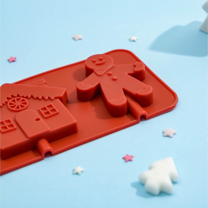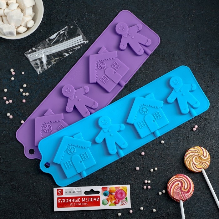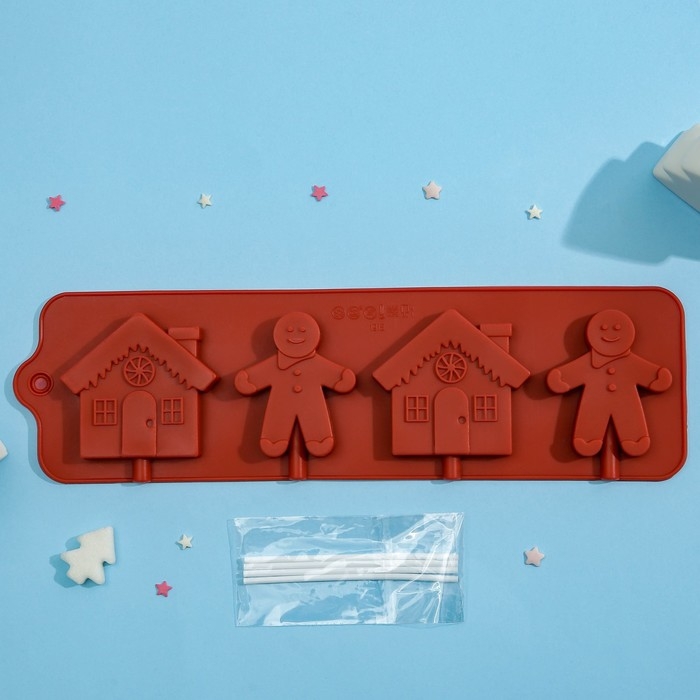 Форма для леденцов новогодняя Доляна «Дом для имбирного пряника», силикон, 31×9 см, 4 ячейки, с палочками, цвет МИКС