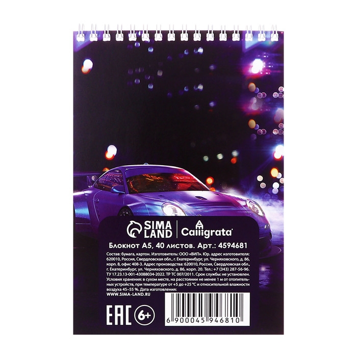 Блокнот А5, 40 листов в клетку на гребне "Sportcar", обложка мелованный картон, блок офсет