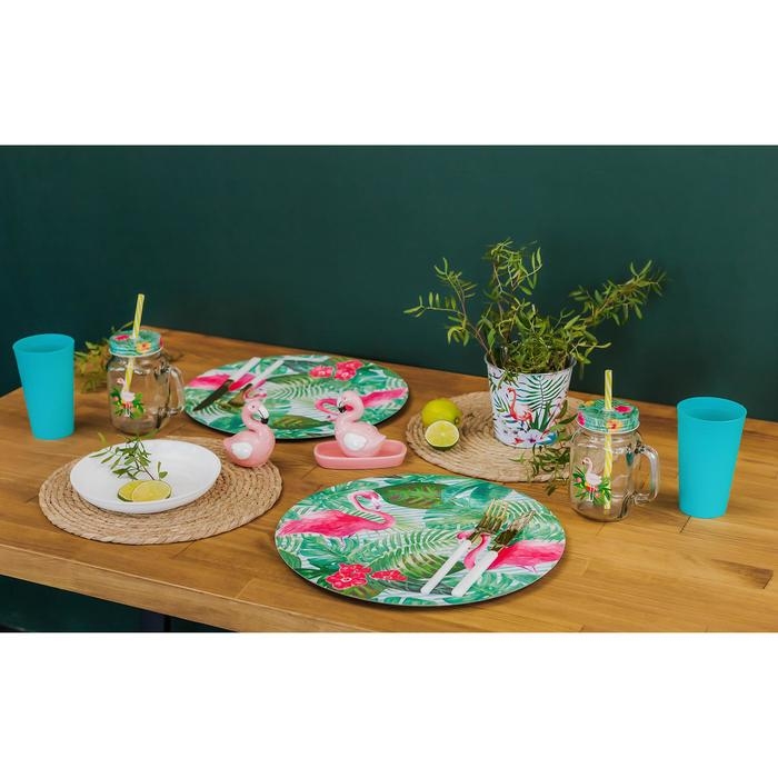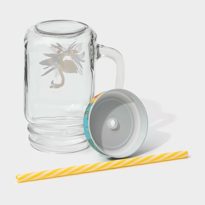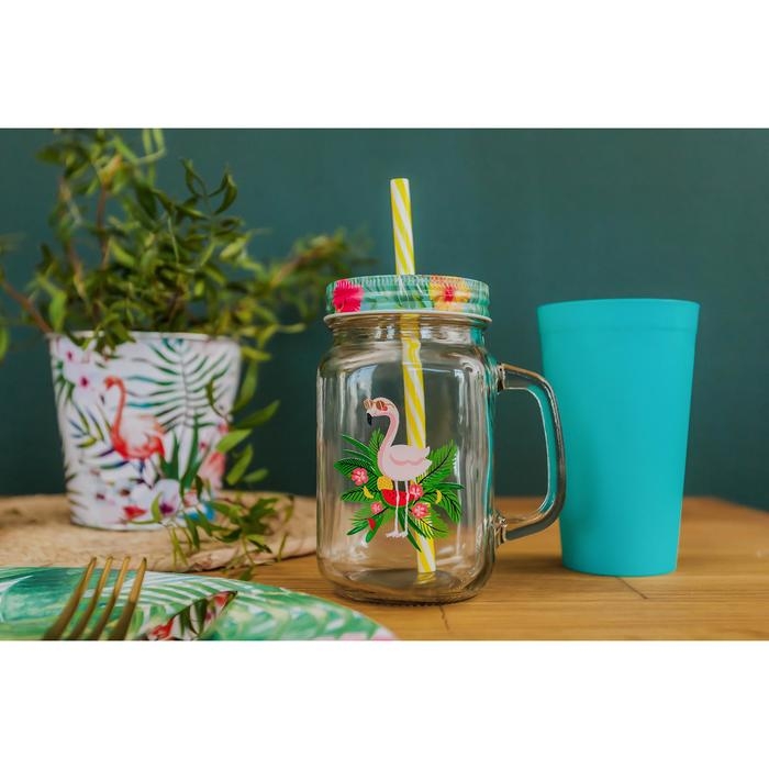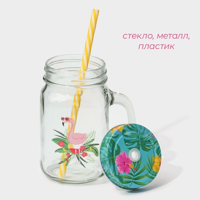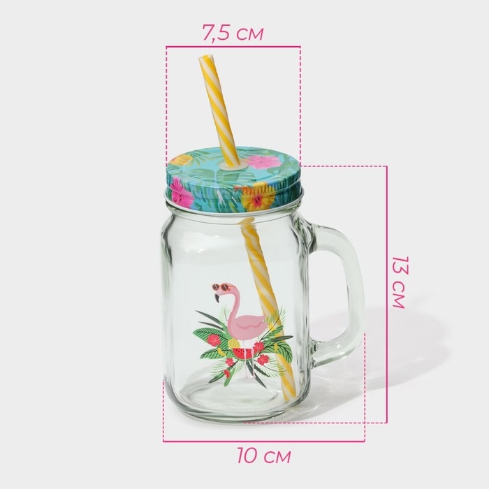 Кружка стеклянная с крышкой и трубочкой Доляна «Фламинго», 450 мл, 10×7,5×13 см