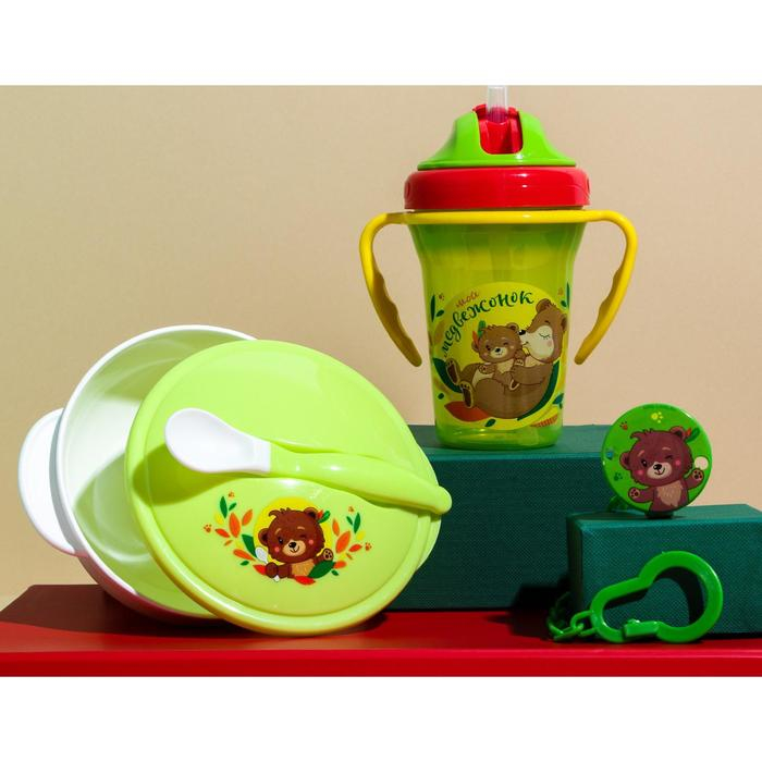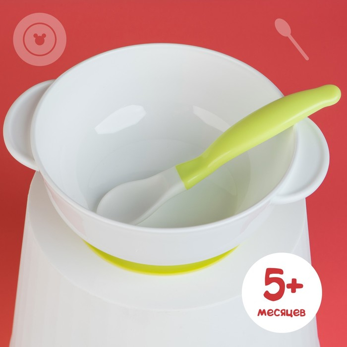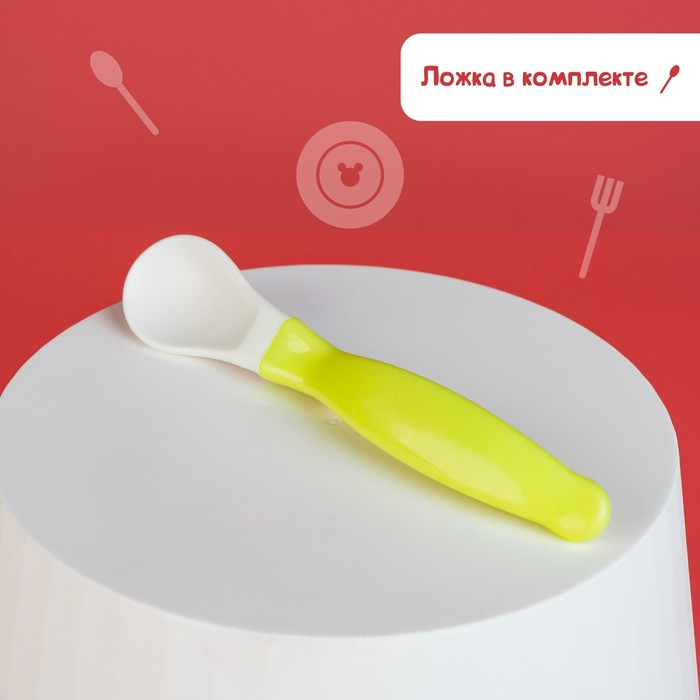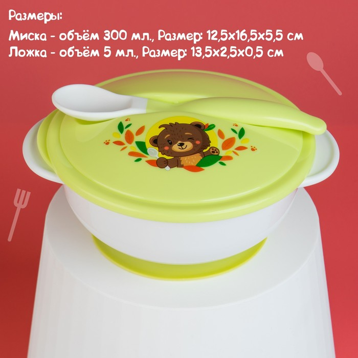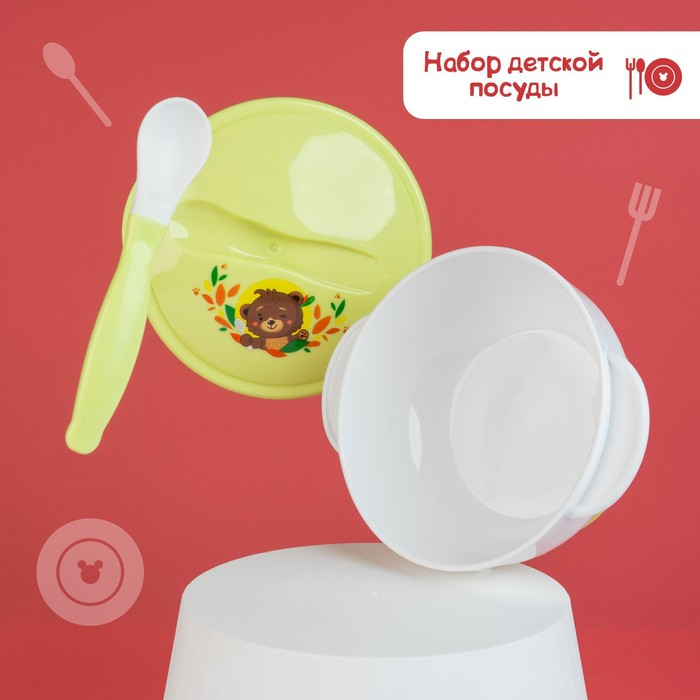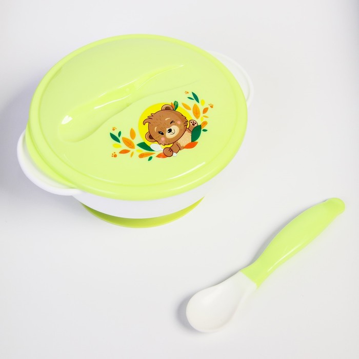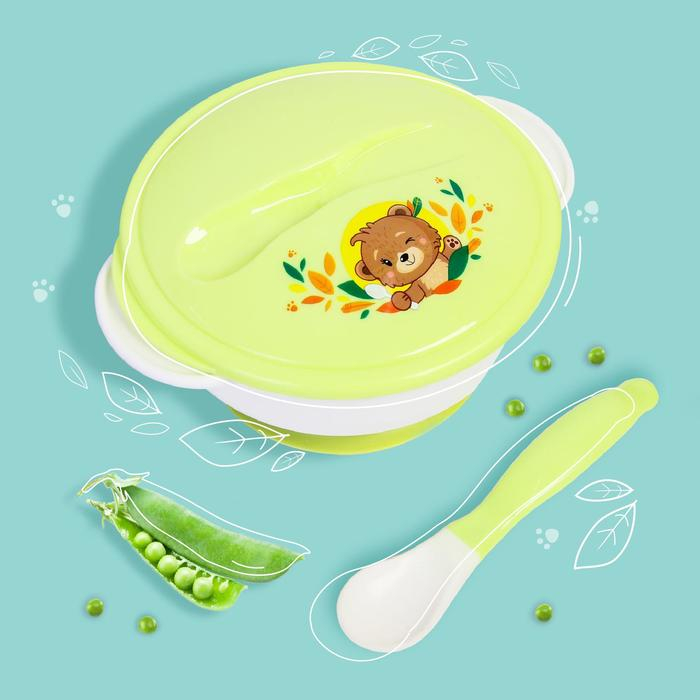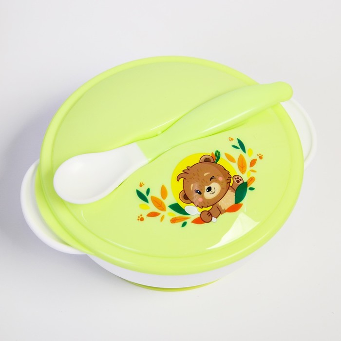 Набор детской посуды «Друзья», 3 предмета: тарелка на присоске, крышка, ложка, цвет зелёный