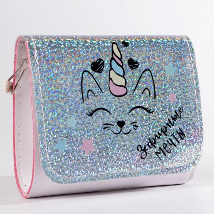 Сумка детская для девочки "Котик", на клапане, голография/белый, 15х4х12 см