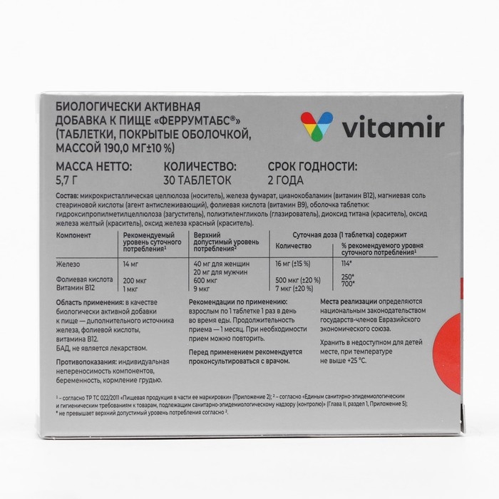 «Феррумтабс ВИТАМИР» — это БАД к пище, рекомендуется в качестве дополнительного источника железа, фолиевой кислоты, витамина В12.
